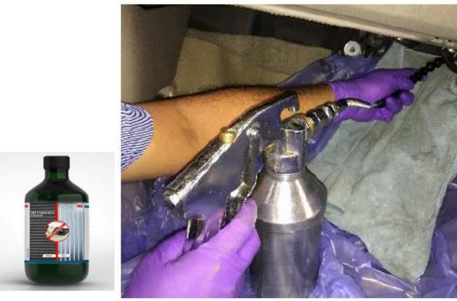 Phun dung dịch AC Eva bằng sung áp lực vào giàn lạnh, phun ngắt quãng, nhấp nhả liên tục cho đến khi hết bình dung dịch.